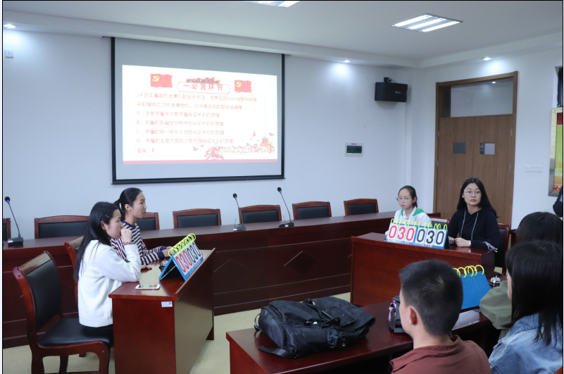 知识竞赛分初赛和决赛两个环节进行,考察内容涵盖习近平新时代中国特色社会主义思想、党章党规、党史国情、形势与政策等方面的内容。初赛吸引了近120名同学参与,12名选手以优秀的笔试成绩脱颖而出,获得决赛资格。4月28日下午,在商公司党员之家,12名选手先后以团队和个人形式进行现场角逐,必答环节他们沉着应战、抢答环节你追我赶,现场气氛紧张激烈。最终,来自17财管的金海兵以其扎实的理论功底、优秀的现场表现斩获桂冠,来自旅游管理、国际贸易等专业的其他选手分别获得二、三等奖。