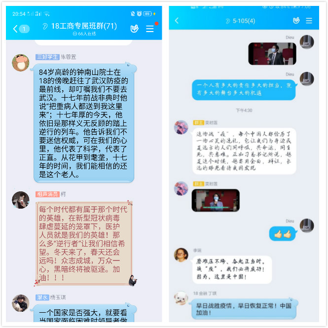 课后,大家纷纷表达了对本次大课及内容的想法。16财管12班李红亮表示“在观看了全国老员工同上一堂疫情防控思政大课后,我们都深化了理论知识,更感受到党和国家始终如一的把人民利益高于一切贯彻在行动中,把人民群众的安全和身体健康放在第一位”;17工商吴添奇表示,在听完这次思政课后,他将决定做到“注意日常学习生活中的个人防护,勤洗手、戴口罩,保护自己、保护他人;合理运用闲暇时间,积极思考不足,将更多精力投入到学习专业知识、增强自身能力上”;19国贸应怡玟感慨“这次疫情不可控因素太多,只有坚定跟着党的指挥,心怀同一个中国梦,才能看到胜利的曙光”。18金融班则倡议,“大写的青春:胸有大志、心有大我 、肩有大任 、行有大德!我们作为老员工,在这个非常时期,每一个人都应担负起一份使命,做防疫科学知识的传播者,坚定信心,不造谣、不信谣、不传谣,坚决执行党委政府的各项措施。”