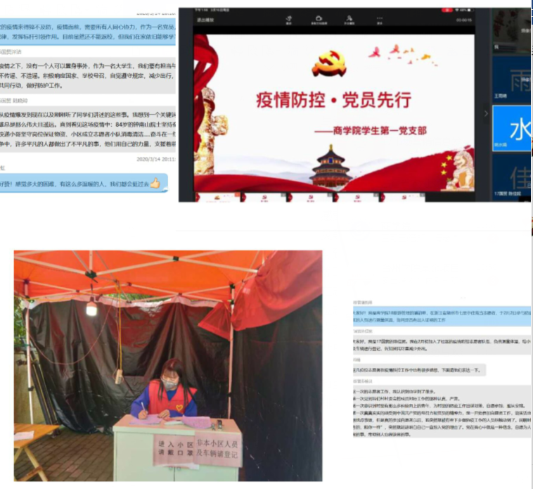 线上,支部书记带领同学们共同学习《习近平:全面提高依法防控依法治理能力 健全国家公共卫生应急管理体系》、《习近平:在中央政治局常委会会议研究应对新型冠状病毒肺炎疫情工作时的讲话》、《习近平:在统筹推进新冠肺炎疫情防控和经济社会发展工作部署会议上的讲话》等讲话精神。大家交流学习体会,感受疫情防控工作中的“中国力量”,17国贸陈佳妮、18旅管的潘韵琳和苏瑜灵等同学分享防疫志愿服务经历。她们响应党的号召,主动加入志愿者队伍,参与到为社区居民量体温、检查身份信息、发放出入证明、张贴疫情防控宣传信息等工作中。这些看似琐碎而平凡的工作,在“防疫攻坚战”中不可缺失,同学们在志愿服务中也感悟颇多。陈佳妮同志说到:“在服务的过程中,我看到了每一位志愿者和工作人员的努力付出,看到了所有人的积极配合。作为一名党员,能为抗击疫情贡献自己的力量,非常有意义。我也深刻理解了‘从群众中来,到群众中去’的真正涵义,中国加油!”。