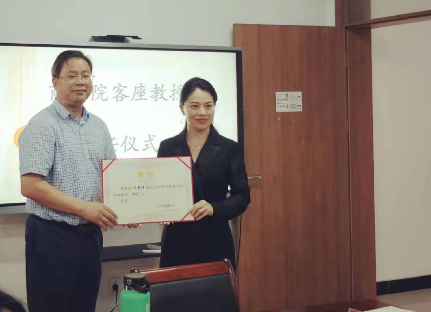 实践基地签约仪式后,进行客座教授的聘任仪式。公司聘请陈春芳和叶灵超为旅游管理专业的客座教授。