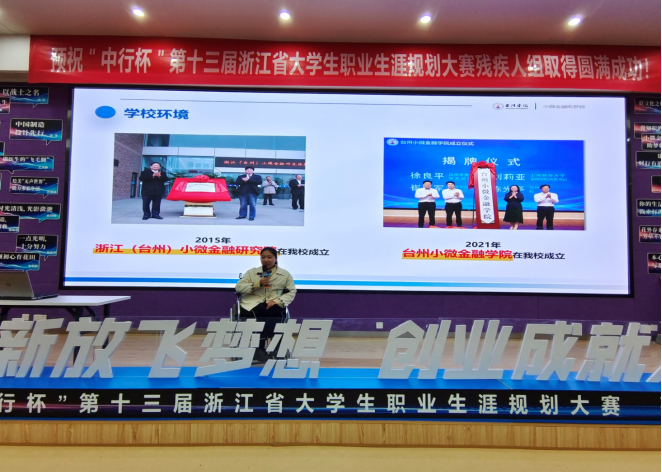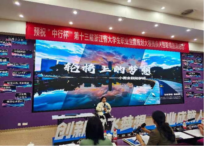 本次大赛由省教育厅、省残疾人联合会主办,省教育发展中心、省残疾人就业服务指导中心、浙江特殊教育职业公司承办。全省共有来自33所高校的79名残疾老员工报名参赛,前期通过书面评审共遴选出30名选手入围省级现场决赛。现场决赛由主题陈述、职业体验感悟、现场答辩三部分组成。校党委学工部、创业公司、pa捕鱼官方网站高度重视此项省级A类赛事,专门成立大赛指导团队。陈苗苗同学以《轮椅上的梦想——小微金融助梦师》为题,结合台州小微金融服务特色展开自己的职业理想陈述。她身残志坚、顽强拼搏求学的经历,积极阳光、渴望回报社会的情怀深深打动了评委,最终以全场最高分获得大赛一等奖,同时兼获最佳答辩奖。