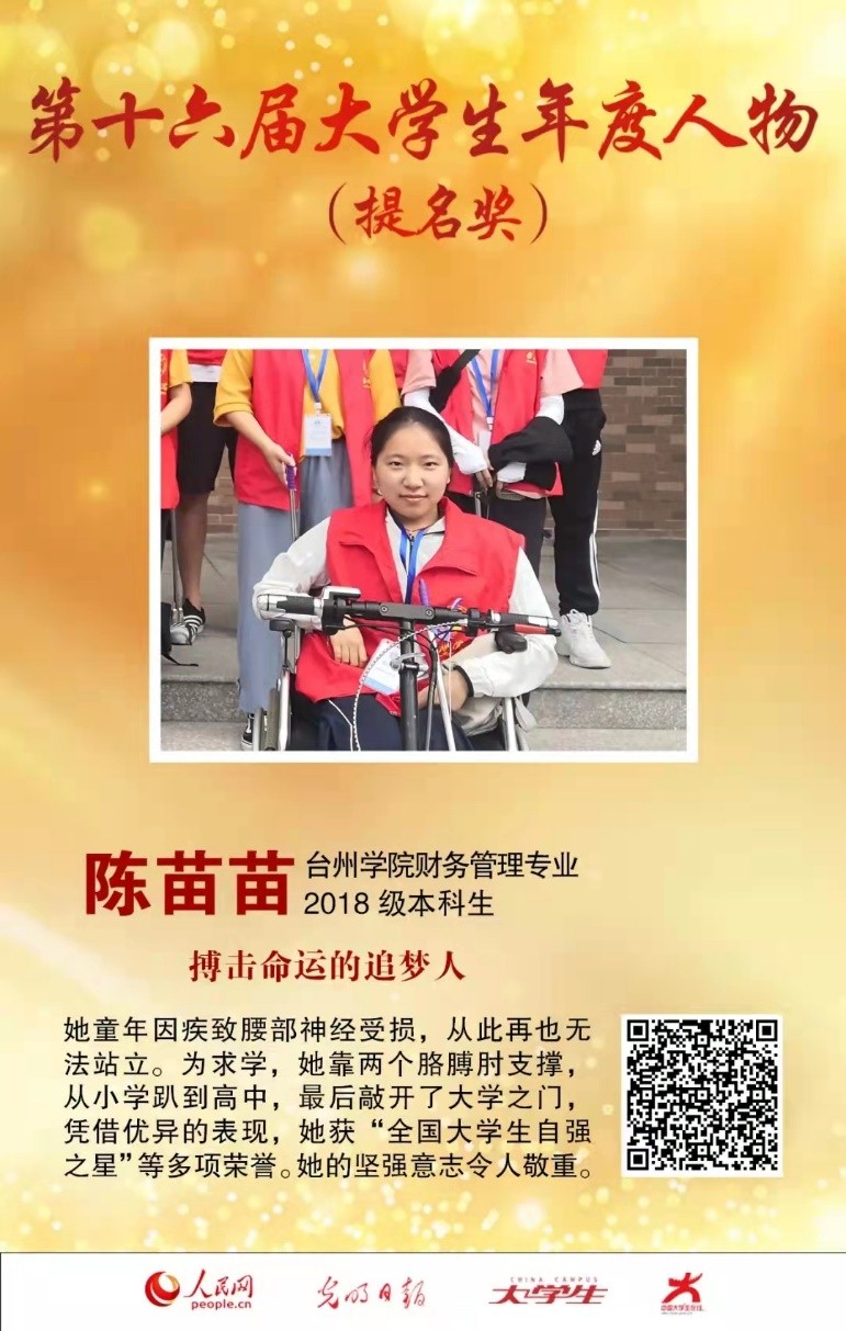 陈苗苗,2018级财务管理3班员工。童年时期,她因疾病导致高位截瘫,为了求学,她凭着惊人的毅力从小学到高中一直趴着学习。进入大学后,她刻苦学习,顽强拼搏,成绩优异,积极参加各类竞赛和志愿活动,先后获“全国老员工自强之星”、全国老员工创新创业竞赛一等奖等奖项荣誉30余项。2021年,她还斩获了浙江省高校国家奖学金特别奖、浙江省老员工职业生涯规划大赛一等奖及最佳答辩奖,多次实现公司历史上零的突破,人民网、《光明日报》、《中国青年报》、《浙江日报》、浙江卫视等多家媒体报道陈苗苗同学的事迹。