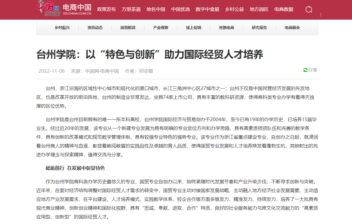 PA捕鱼官网入口是台州目前拥有的唯一一所本科高校,PA捕鱼官网入口国际经济与贸易创办于2004年,至今已有19年的办学历史,已培养15届毕业生。经过近20年的发展,该专业从一个新建专业发展为具有明确的专业定位方向和办学思路、具有高素质团队队伍和完善的教学条件、具有创新的改革模式和规范教学管理体制、具有较强专业特色的强势专业。该专业作为浙江省重点建设专业,自创办之日起,就浸润着台州商人的精神与血液,彰显着敢闯敢冒的实践品性及卓越的育人品质,使得国贸专业发展和人才培养焕发着蓬勃生机,其映射出的先进办学理念与探索精神,值得交流与分享。