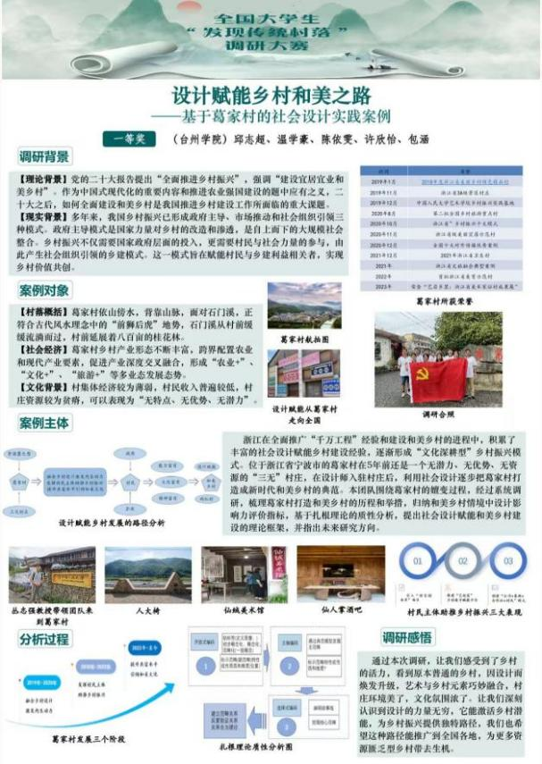 pa捕鱼官方网站“设计赋能乡村振兴”暑期社会实践队紧跟时代步伐,以“设 计赋能乡村和美之路”为主题,秉持“深入乡村,知行合一”的理念,在指导老师陈国栋的带领下,前往宁波市葛家村,开展本次调研,以《乡村振兴的维度》文本作为理论来源、问题导引,在其跨越时空的思想力量指导下,本文使 用文献研究、实地调研等方法,围绕葛家村的嬗变过程,经过系统调研,梳理葛 家村打造和美乡村的历程和举措,归纳和美乡村情境中设计影响力评价指标,提出社会设计赋能和美乡村建设的理论框架,并指出未来研究方向。