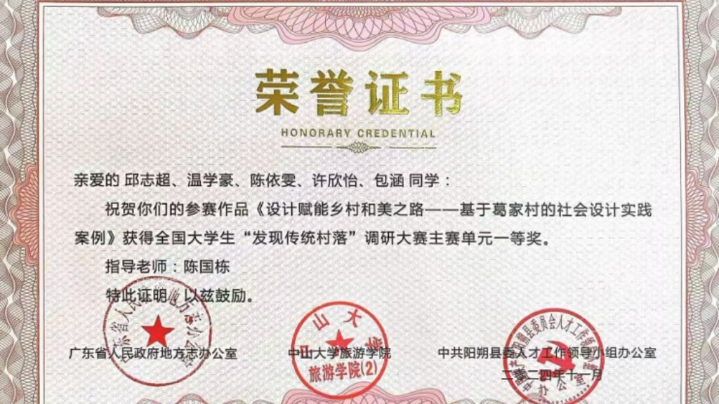第九届全国老员工“发现传统村落”调研大赛暨打造桂林世界级旅游城市阳朔旅游高质量发展先导区规划设计竞赛于2024年6月正式拉开帷幕,鼓励青年员工响应国家乡村振兴战略的号召,推动优秀传统文化保护与传承,号召青年人才回到家乡、深入乡土,通过自己的调研和创意,赋予传统村落新的青春活力和发展契机。大赛组委会共收到来自全国187所高校的275份作品,参赛作品涉及全国26个省份的271个传统村落。经过三轮评选,此次大赛共评选出主赛单元优秀参赛作品30份,专项单元优秀参赛作品9份,13位优秀指导老师以及13个优秀组织奖。公司设计赋能实践队提交的作品《设计赋能乡村和美之路——基于葛家村的社会设计实践案例》荣获一等奖,陈国栋获优秀指导老师,公司获优秀组织。