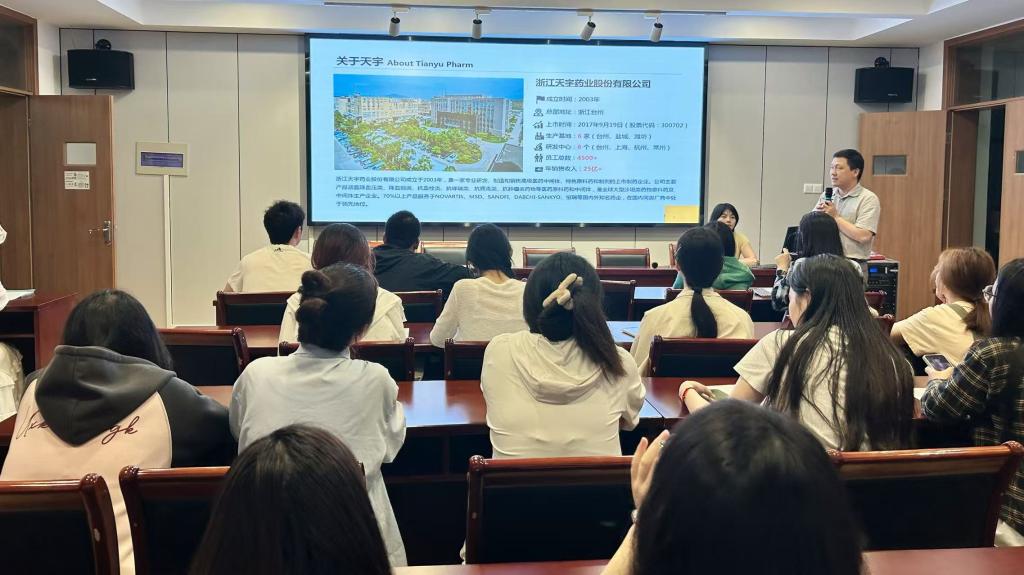 宣讲会上,虞跃借助企业宣传片,全面介绍了天宇药业的发展历程、产业布局及核心业务。作为一家专业研发、生产、销售高级医药中间体及原料药的现代化制药企业,天宇药业自2003年成立以来,已成长为全球心血管类原料药的主要制造商之一,产品覆盖降血压、降血糖、抗血栓等多个领域,市场遍布海内外。公司总部位于浙江台州,并在上海、潍坊、盐城等地设有多个研发中心与生产基地,员工规模超4000人,并于2017年在深交所上市。
