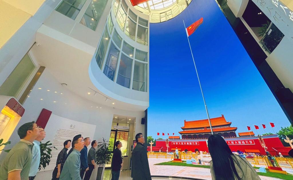 初到国旗教育馆,映入眼帘的是一座以“天圆地方、天瑞地安、鼎盛中华、红旗飘扬”为设计主题的造型独特的建筑。步入大厅,高15米的巨幅大屏上展示着天安门广场与五星红旗,让人肃然起敬。在这面国旗下,伴随着激昂的国歌声,全体党员们行注目礼,进行了一场庄严的升旗仪式。