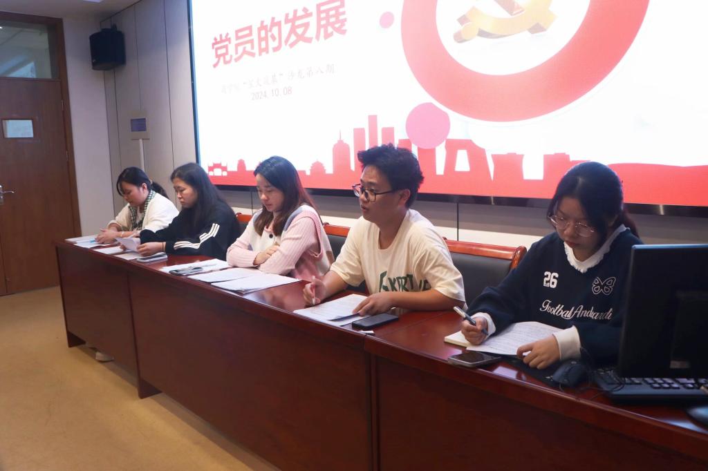 吴佳妲老师对党建工作的基本要求、党员发展过程进行了细致的讲解。党建事业的深远影响如同灯塔一般,它不仅关乎党的核心领导地位的稳固,更是强化党组织向心力与战斗力的核心驱动力,在培养新时代党员骨干、营造风清气正的校园党建氛围方面,发挥着不可替代的作用。党建联系人是各班团支部与党组织连接的重要纽带,要求有宣传组织作用和引领带动发展的能力,党建工作的重要性不言而喻。寄希望于党建联系人在秋季入党积极分子、发展对象以及党员的预备和转正工作中起到重要的推进作用。在互动交流环节,各支部纷纷提出自己的工作难点,老师一一解答,现场交流氛围活跃。