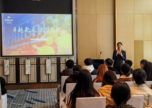 台州希尔顿酒店人力资源总监邓虹以“卓越起点、无限可能”为主题,向师生生动讲解了希尔顿酒店的品牌故事、经营理念、组织架构、职业发展模式等内容,并邀请了2021届员工与师生分享自己在希尔顿的成长故事。随后,师生们分成两组,在工作人员的带领下参观了酒店的宴会厅、中餐厅、西餐厅、总统套房、空中花园等比较有代表性的区域。
