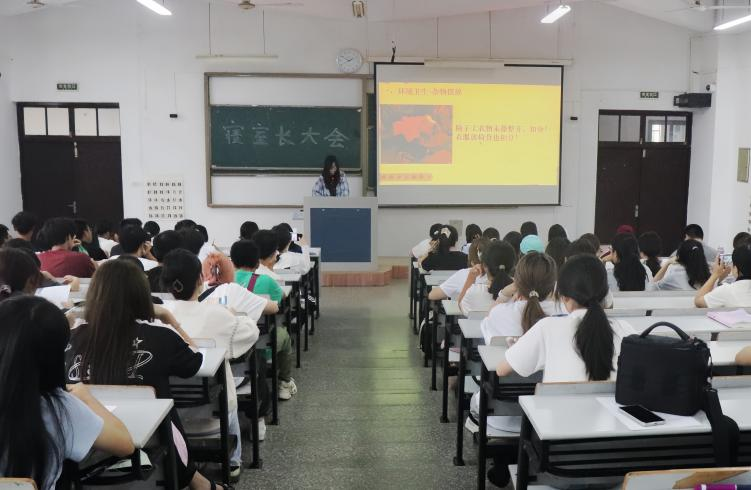 会上,李佳丽同学对新学期寝室卫生检查标准进行讲解,强调具体扣分细则和内务整理要求,希望寝室长们能够督促寝室成员做好寝室卫生工作。随后,李佳丽同学又对寝室的用电规范作出了详细说明,强调使用违规电器的危害,严禁私拉乱接电线和各种违规用电行为,号召同学们养成人走即断电的好习惯。此外,围绕特色寝室、文明寝室的创建,李佳丽同学向大家分析了相关评选规则,并强调评选结果对员工综合素质考评的重要性,最后,针对大一新生寝室长,纪检部成员也细心讲解了晚归打卡制度,呼吁各位寝室长主动承担起职责,多关心、帮助室友,有特殊情况时立即上报老师。