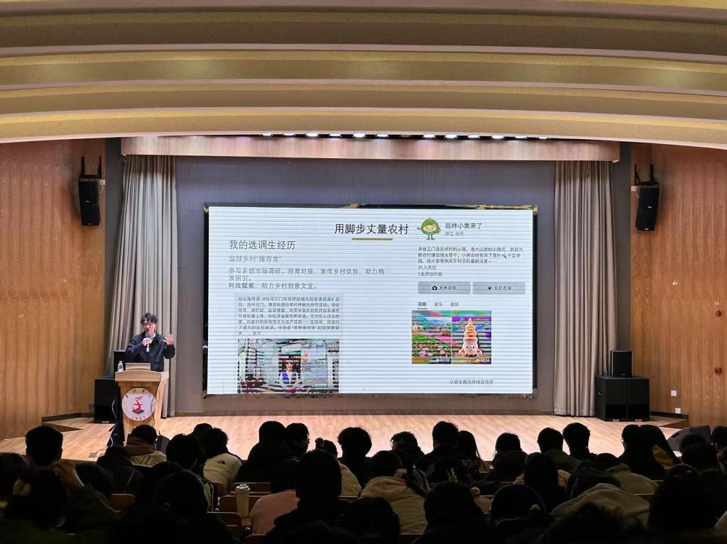 杜硕以自身丰富且独特的履历为切入点,生动地讲述了他从刑事科学技术到人工智能研究,再到乡村干部的跨界成长经历与职业选择思考。分享中,杜硕结合“森林里的兔子”这一寓意深刻的故事,深入浅出地阐释了确立清晰目标的重要性。他强调,在职业发展中,明确的目标如同明灯,能指引大家在复杂的环境中稳步前行,避免陷入盲目追寻的困境。讲座中他乡村题材的原创视频给同学们留下了深刻影响,不仅让同学们感受到复合型人才在交叉领域的独特优势,更激励了同学们发挥青年优势,在乡村开展创新创业,以青春热血拥抱乡村振兴。