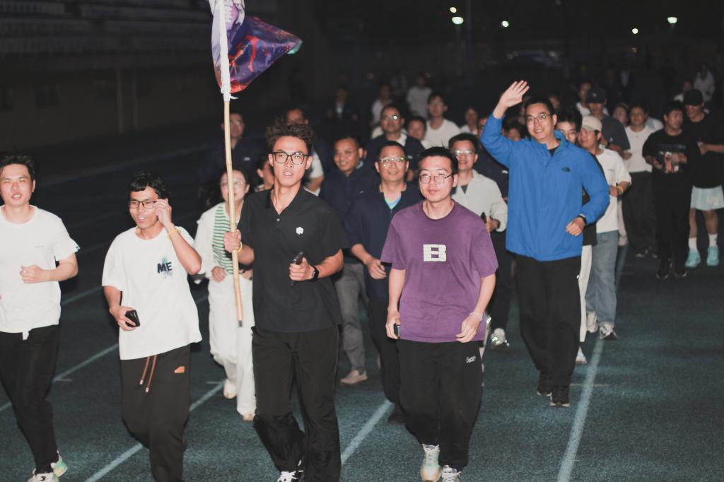 活动开始前,马斌发表动员讲话,强调运动对身心健康与学习工作的重要意义,他鼓励师生在夜跑中释放活力,用实际行动践行健康生活的理念。随后,陈斌岚为夜跑队伍授旗,象征着活动正式拉开序幕。夜跑过程中,师生们佩戴荧光棒,围绕操场奔跑,形成了一道亮丽的风景线。除了夜跑,活动还增设了抽奖和荧光涂鸦等环节,增添了趣味性和互动性,让参与者在运动的同时也享受到了欢乐,将活动氛围推向新高潮。