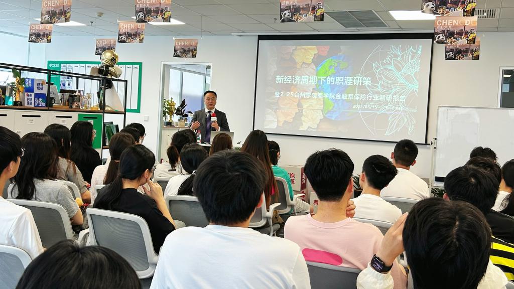 5月14日,pa捕鱼官方网站金融学专业师生80余名走进中宏保险,开启行业深度调研。同学们通过实地走访,了解当前台州人寿保险的发展现状、经营范围、保险产品,调研保险公司的经营战略、营销方式、产品销售情况,探索保险业当前面临的挑战、未来发展趋势及人才需求。中宏保险台州中心支公司负责人任敏给员工带来了一场内容丰富的就业指导讲座。他介绍了中宏保险的前世今生,并从保险的起源、保险的发展、台州保险的市场分析、职业生涯发展思考四个方面与同学们展开深度交流。他提出,保险业正在经历人力爆发到结构性调整的规模性成长阶段,面对全球从“乌卡时代”(VUCA)向“巴尼时代”(BANI)的演变,建议同学们培养“反脆弱”思维,主动拥抱不确定性。