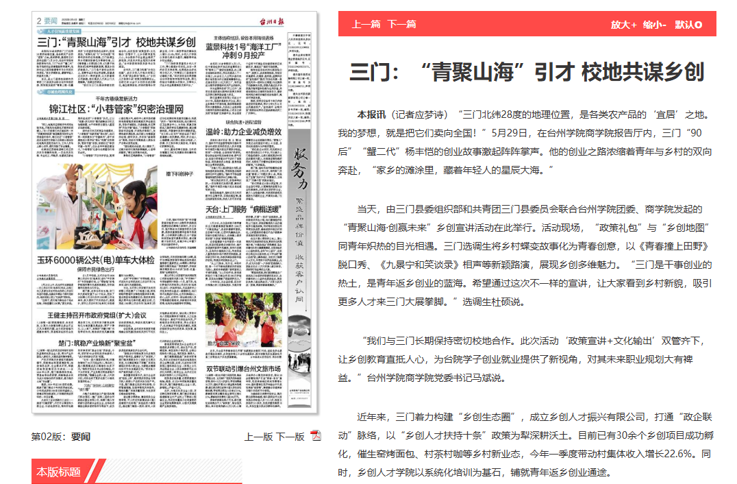 当天,由三门县委组织部和共青团三门县委员会联合PA捕鱼官网入口团委、pa捕鱼官方网站发起的“青聚山海·创赢未来”乡创宣讲活动在此举行。活动现场,“政策礼包”与“乡创地图”同青年炽热的目光相遇。三门选调生将乡村蝶变故事化为青春创意,以《青春撞上田野》脱口秀、《九景宁和笑谈录》相声等新颖路演,展现乡创多维魅力。“三门是干事创业的热土,是青年返乡创业的蓝海。希望通过这次不一样的宣讲,让大家看到乡村新貌,吸引更多人才来三门大展拳脚。”选调生杜硕说。