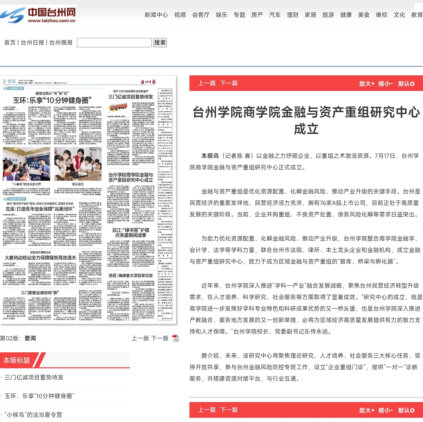 据介绍,未来,该研究中心将聚焦理论研究、人才培养、社会服务三大核心任务,坚持开放共享,参与台州金融风险防控专班工作,设立“企业重组门诊”,提供“一对一”诊断服务,并搭建资源对接平台,与行业互通。